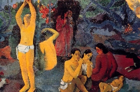 &اعماق الفنان السحيقة. لا احد يعلم". اعمال غوغان في تاهيتي، تلك "الورشة الاستوائية" التي عاني فيها من المرض والبؤس والوحدة، في نهاية حياته المأسوية، تفتح لنا سكة مفروشة بالالوان والحب والورود علي حياة " فطرية" جديدة، وتشي بميلاد فن جديد بسيط، ربما يكون فنا للمستقبل، ولعله كان غوغان في وحدته في جزر الماركيز، كان يفكر في المستقبل وهو يرسم الحاضر، ليبدع فنا يناسب عصرنا وزمننا، زمن تحرير البيئة من اخطار التلوث، ورغبتنا في العودة الي احضان الطبيعة، والتعرف من جديد كما في لوحاته والوانه في نهاية رحلتنا في المعرض، التعرف علي تلك البراءة، التي ربما نكون فقدناها في عالمنا المادي المسعور والي الابد، واكتشاف انفسنا والعالم من جديد..