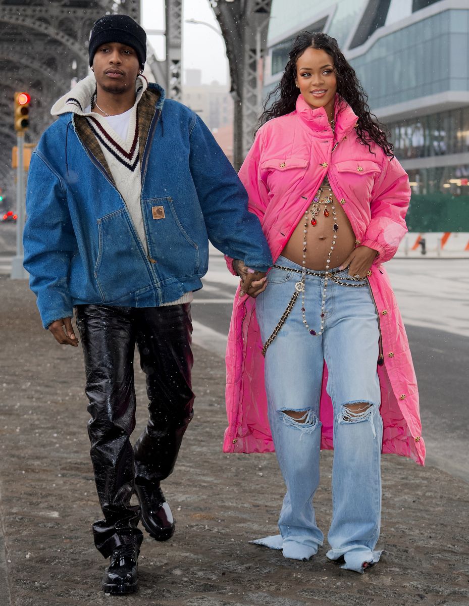 تم تصويرهما في مدينة نيويورك خلال عطلة نهاية الأسبوع ، حيث ظهرت ريهانا لأول مرة وهي ترتدي سترة وردية طويلة مفككة الأزرار تظهر بطنها المنتفخة المزينة بصليب ذهبي مع جواهر ملونة.