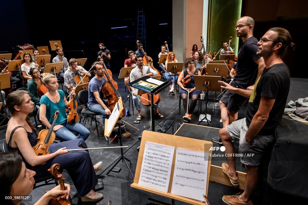فلوريان كولومبو (يمين) يتحدث إلى أعضاء أوركسترا "نيكسوس" (Nexus) بجوار غيّوم بيرنيه (Guillaume Berney) الثاني الى اليمين، خلال البروفة في لوزان في 2 أيلول/ سبتمبر 2021