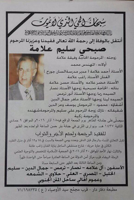 وتقبل التعازي للنساء والرجال قبل الدفن وبعده يوميْ الجمعة والسبت 18 و 19 مارس في منزل الفقيد الكائن في منطقة حارة حريك ـ شارع مستشفى الساحل بناية الفنّان راغب علامة.
