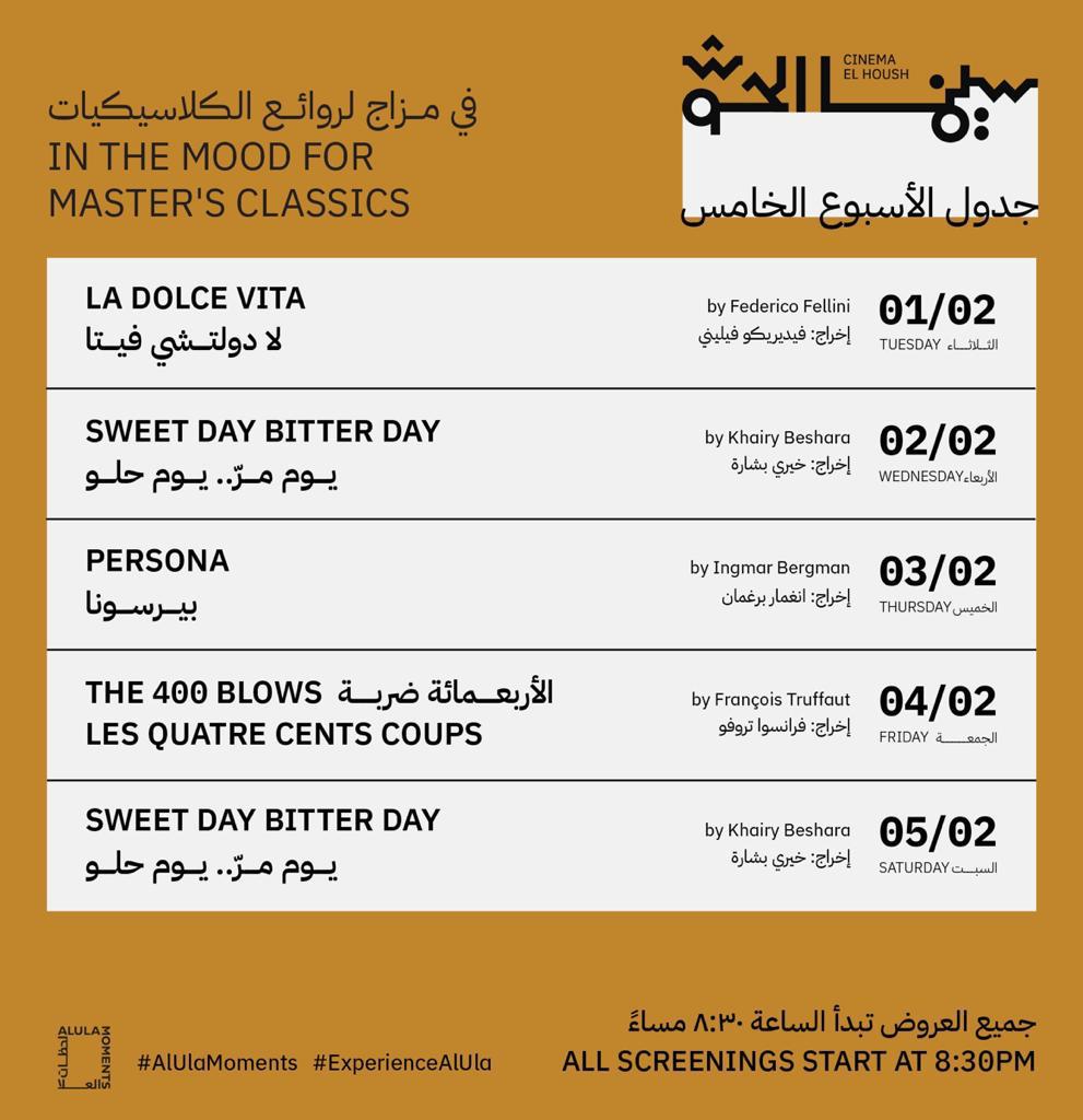 أولى عروض الأسبوع الخامس وهو أسبوع (في مزاج لروائع الكلاسيكيات ) الفيلم الأيقوني "لادولتشي فيتا" للمخرج العملاق فيديريكو فيلليني ومن بطولة لممثلة الشهيرة أنيتا إيكبرج، ملكة جمال السويد التي انتقلت إلى هوليوود بحثًا عن الشهرة، وتم تخليدها بهذا الفيلم .