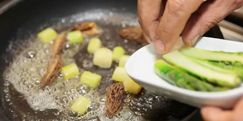 4 - Sauté: لطهي الطعام بسرعة على نارٍ ساخنة مباشرة على حرارةٍ متوسطة إلى عالية مع كمية صغيرة من الزيت أو الزبدة في المقلاة. لكن، لتنجح هذه الطريقة، يجب وضع المواد المراد طهيها في المقلاة عندما تُصبِح ساخنة بما فيه الكفاية. لذا، قبل أن تُضاف المكونات مثل البصل المفروم أو أي نوع من الخضراوات أو اللحوم، أضيفوا حبة منها لتتأكدوا من وجود صوت الأزيز عند إضافتها. فإذا لم تسمعوا صوت الأزيز إنتظروا حتى تصل المقلاة إلى الحرارة المطلوبة. والجدير بالذكر، أنه في حالة استخدام الزبدة، يجب أن تبدأ بالغليان قبل إضافة أي شيء ولكن إحذروا في حال استخدامكم للزبدة أو زيت الزيتون والزيوت، لأنه يجب أن تضيفوا المواد المنوي طهيها قبل احتراق الزبدة أو الزيت.