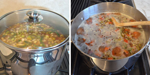 5 - Simmering: تعني طهي الطعام على نارٍ خفيفة لمدة طويلة. بحيث يُترك الطعام على نارٍ خفيفة - لينضج بلطف في السائل دون نقطة الغليان. أي يُطهى على نارٍ خفيفة لينضج ببطء شديد حيث تصعد من المزيج فقاعات صغيرة سرعان ما تنكسر على سطحه من دقيقة لأخرى أو نحو ذلك، دون أن تظهر فقاعات كبيرة وينقلب الخليط ويفور كما في حالة الغليان. وهذه الطريقة جيدة جدا لطهي المرق وعدة أنواع من الحساء بحيث يترك الخليط لينضج على نارٍ هادئة بظهور فقاعات صغيرة على السطح باستمرار، ولكن ببطءٍ شديد، وقد تطول فترة الطهي هذه لساعات حتى ينضج الحساء.