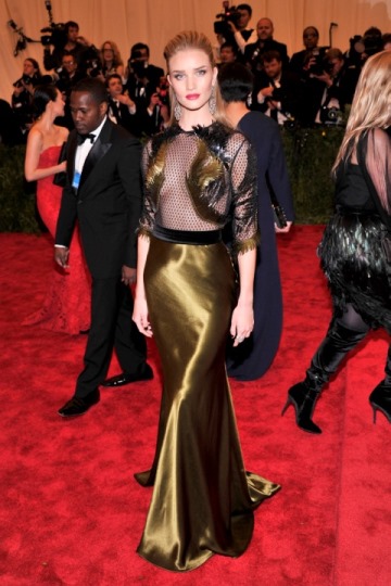 وإرتدت روزي هنتنغتون- وايتلي ثوباً باللونين الأسود والذهبي، مطرزاً بالتول في القسم العلوي منه مع الترتر، فيما تنسدل تنورة من الساتان الذهبي المميز. الفستان من مجموعة غوتشي لخريف / شتاء 2013-2014.