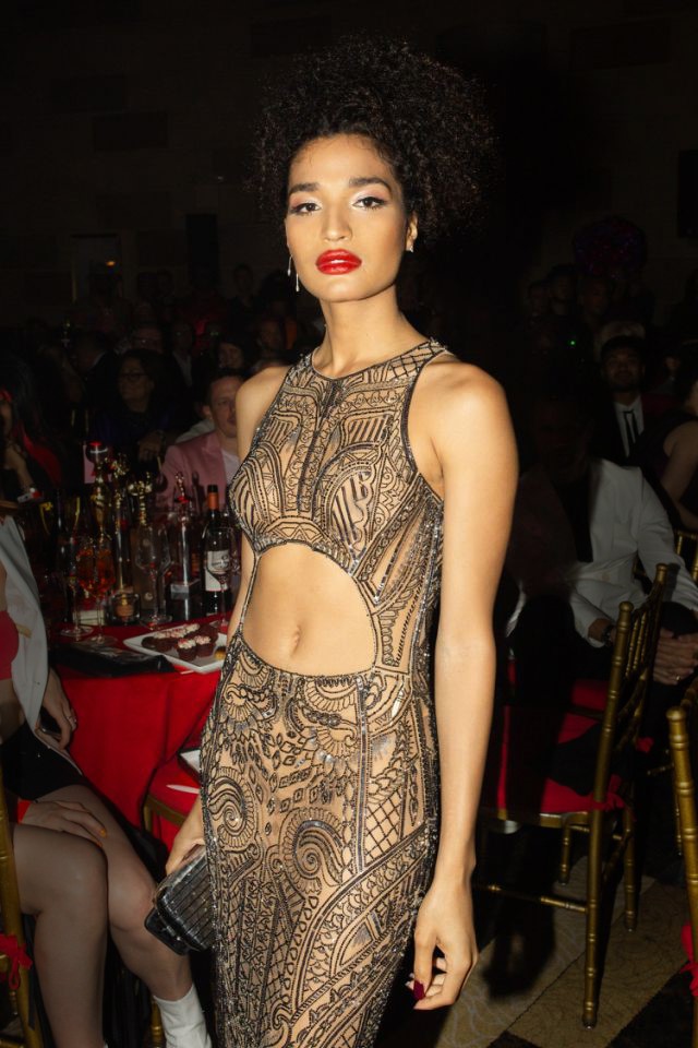 وارتدت النجمة، انديا مور، فستاناً شفافاً من التول ومطزر بأكمله بحبات خرز وترتر من اللؤلؤ من تشكيلة روبرتو كافالي لخريف وشتاء 2019/ 2020 خلال حضورها ومشاركتها في لجنة تحكيم مجلس مصممي الموضة في أميركا بمدينة نيويورك.