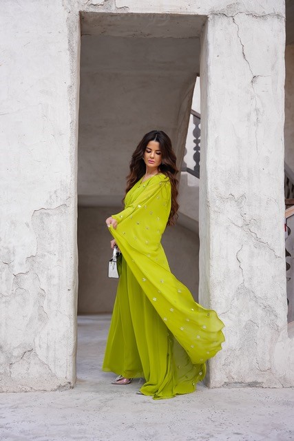 -هذا القفطان من "Taller Marmo" المفضل لديها يجعلها تشعر بالجمال مع ابتكاراته المذهلة. هذه الستارة الفضفاضة مع النقش الذهبية هي كل ما تحتاجه في رمضان. لإكمال إطلالتها المتوهجة ، اختارت حذاء "Manolo Blahnik" من الدانتيل لتحويل البريق إلى أقصى حد.
