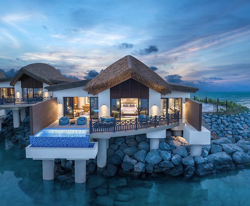 ويأتي تصميم المنتجع من إبداع شركتيّ ويلسون أسوشيتس وبيركنز إيستمان، ليوفر للضيوف تجارب فاخرة مستوحاة من جزر المالديف، حيث يتميز بالفلل العائمة فوق الماء والتي تعد الأولى من نوعها في الإمارة، والتي تضم مساحة داخلية واسعة ومنصة خارجية فسيحة "ترس" وحوض سباحة خاص، فضلاً عن الإطلالات على الخليج العربي وبحيرة ومحمية أشجار القرم الطبيعية، بالإضافة إلى كوخ مخصص يقع على الشاطئ الخاص بكل فيلا. ويوفر المنتجع خدمة مضيف الفيلا المخصصة لتلبية احتياجات الضيوف وتفضيلاتهم في كافة الأوقات، كما يمكنهم الاستمتاع بمجموعة من التجارب المجانية مثل جلسات التدليك وحفلات الشواء الخاصة.