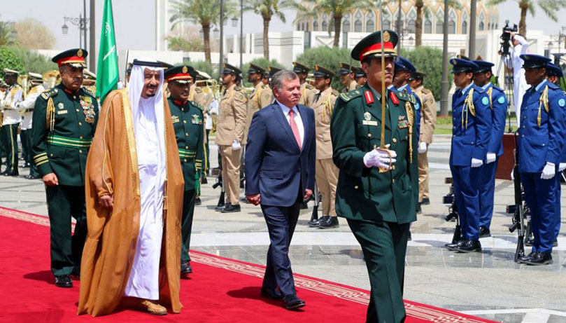 وكان جرى للعاهل الأردني لدى وصوله قصر اليمامة، في العاصمة الرياض، مراسم استقبال رسمي، حيث استعرض الزعيمان حرس الشرف الذي اصطف لتحيتهما، فيما عزفت الموسيقى السلام الملكي لكلا البلدين.&