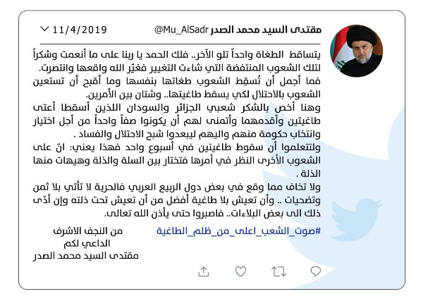 وكتب الصدر في تغريدة على حسابه الخاص بتويتر قائلا "يتساقط الطغاة واحداً تلو الآخر.. فلك الحمد يا ربنا على ما أنعمت وشكراً لتلك الشعوب المنتفضة التي شاءت التغيير فغير الله واقعها وانتصرت فما أجمل أن تُسقِط الشعوب طغاتها بنفسها وما أقبح أن تستعين الشعوب بالاحتلال لكي يسقط طاغيتها.. وشتان بين الأمرين".