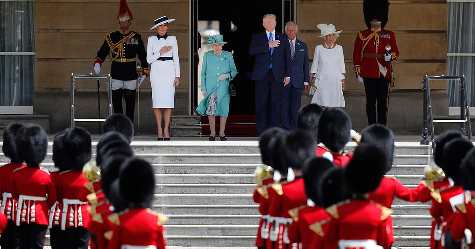 ووصل ترمب وميلانيا إلى القصر الملكي على متن المروحية العسكرية الرئاسية الشهيرة (Marine One) التي حطّت في الحديقة الخفية للقصر الملكي. حيث أطلقت المدفعية 21 طلقة تحية للضيف من حديقة غرين بارك القريبة من القصر ومن برج لندن البعيد تقريبا.