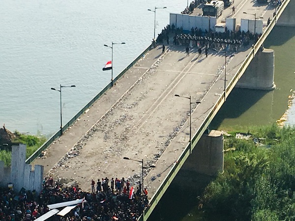 جسر الجمهورية الى المنطقة الخضراء .. المحتجون في مواجهة القوات الامنية