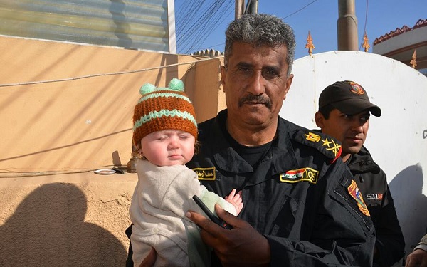 الفريق الركن عبد الوهاب الساعدي يحمل طفلا في جولة لاحياء محررة بالموصل