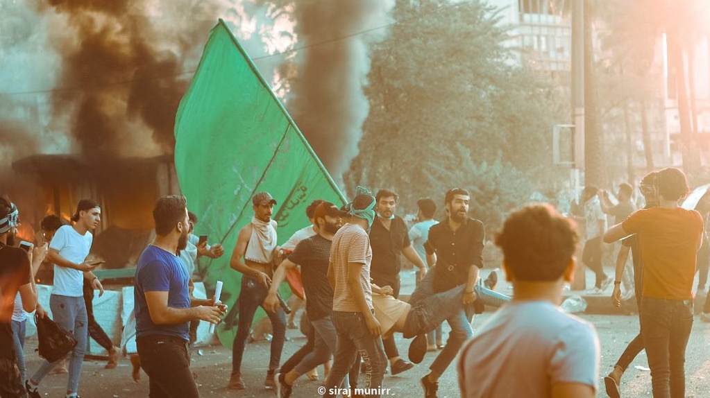 واوضحت مقاطع الفيديو نيرانا تشتعل في كرافانات قوات مكافحة الشغب في ساحة التحرير التي تجمع فيها المتظاهرون من بغداد وستة محافظات اخرى قدموا اليها في وقت سابق اليوم رافعين شعارات "من قتلني؟" مطالبين الحكومة والقضاء العراقيين بالكشف عن قتلة الناشطين والاعلاميين .