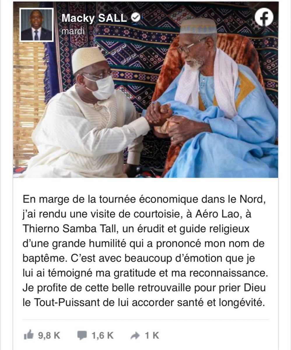 كانت لحظة عاطفية، كما وصفها الرئيس السنغالي، وهو ينشر صورة للقاء عبر صفحته الشخصية على فيسبوك ، متحدثا بكثير من الاحترام والتقدير عن تييرنو صمبا تال، معلنا أنه هو من اختار اسمه بعد ولادته، كان ذلك في شهر ديسمبر 1961، في منطقة «فاتيك» وسط السنغال.