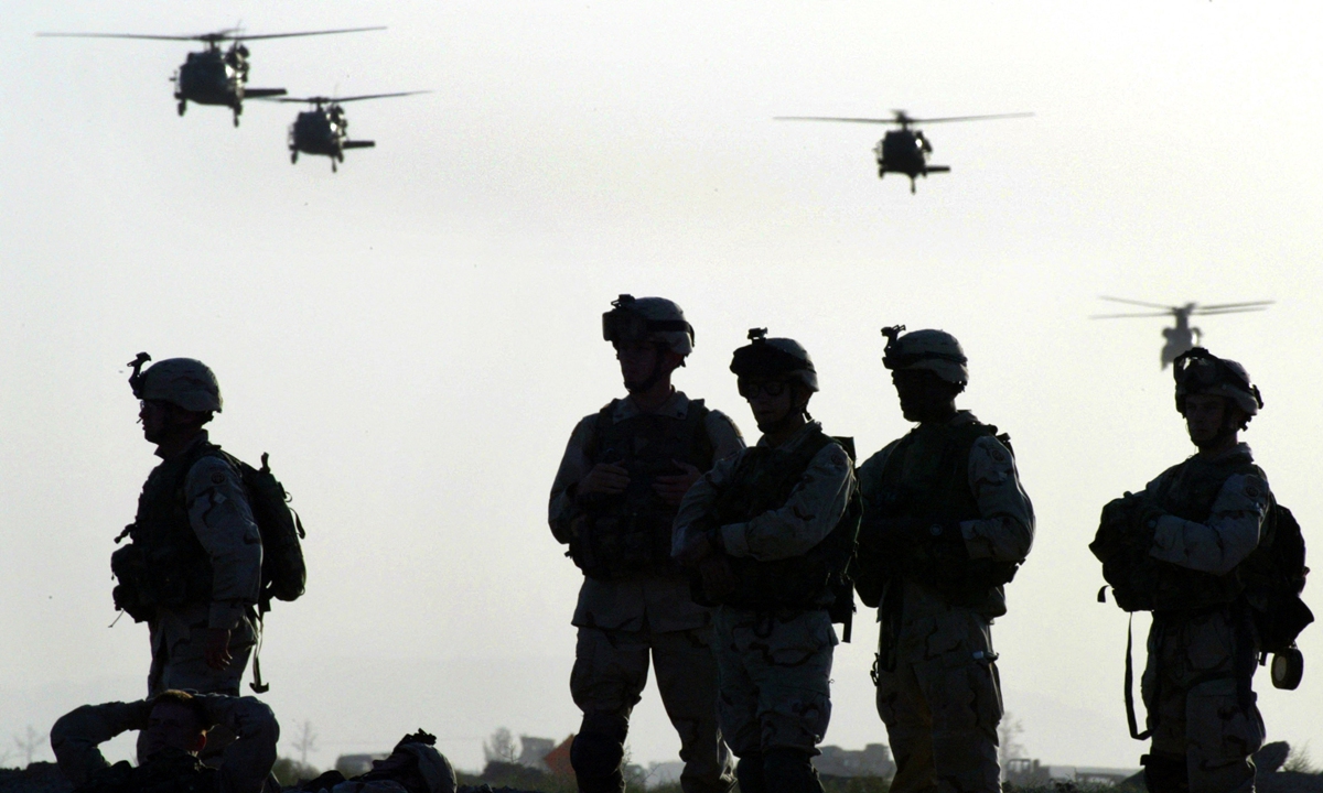(جنود أمريكيون ينتظرون الصعود على متن مروحيات في قاعدة قندهار الجوية قبل عملية في أفغانستان في 19 أيار/ مايو 2003)
