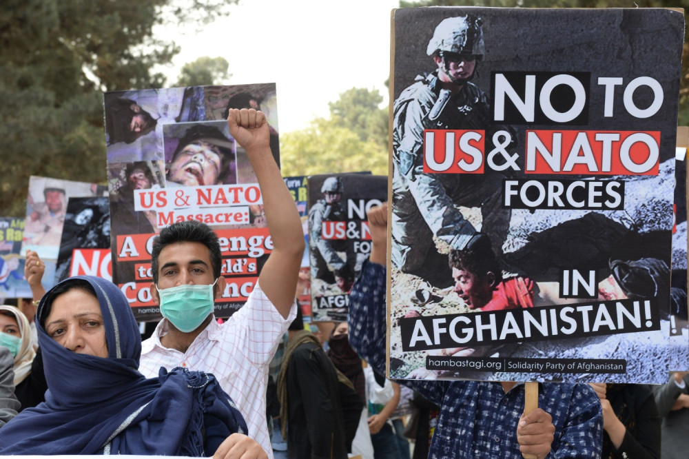 (أعضاء حزب التضامن الأفغاني يتظاهرون ضد الغزو الذي قادته الولايات المتحدة لأفغانستان قبل الذكرى السادسة عشرة لتأسيسه في كابول في 6 تشرين الأول/ أكتوبر 2017)
