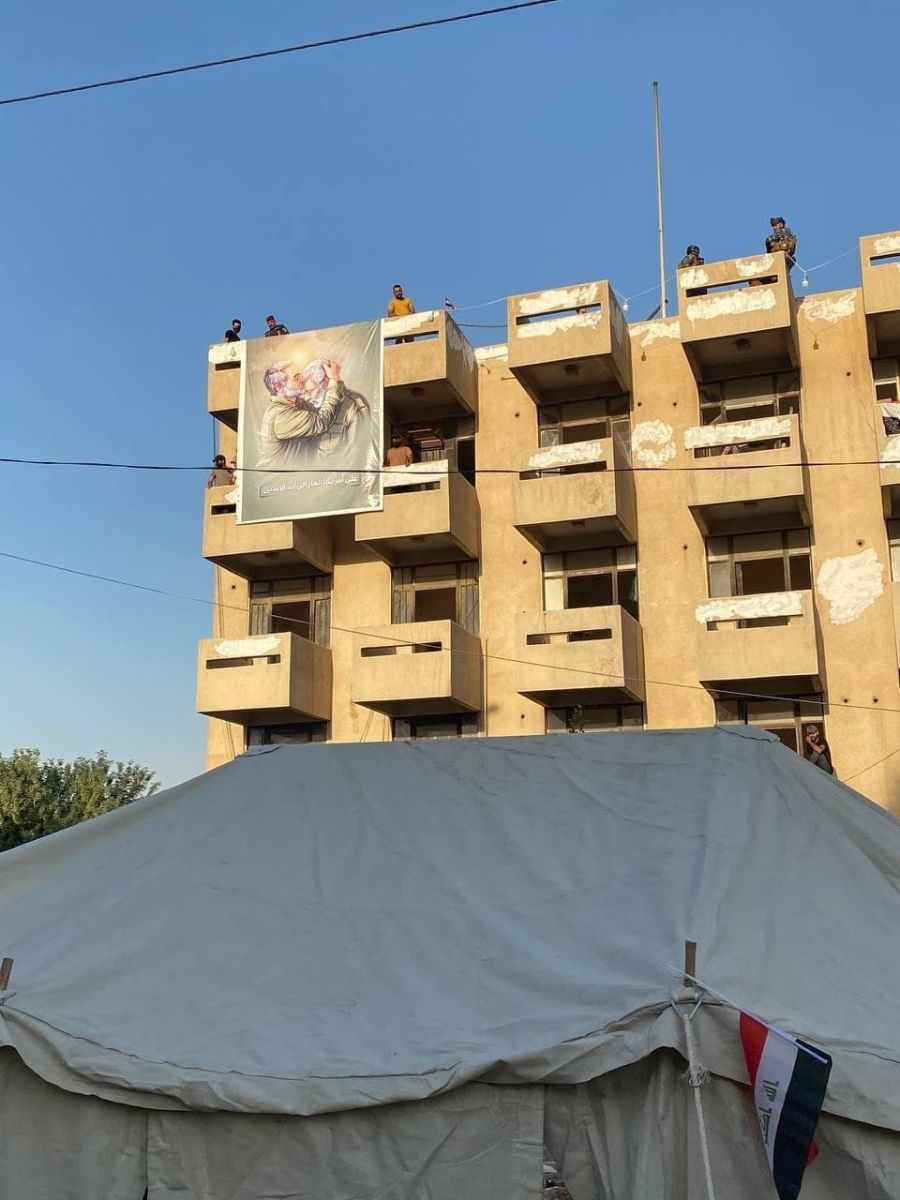 فقد رفع المتظاهرون المحتجون على نتائج الانتخابات بالقرب من المنطقة الخضراء وسط العاصمة صورة لنائب رئيس الحشد الشعبي ابو مهندي المهندس وقائد فيلق القدس في الحرس الثوري الايراني قاسم سليماني اللذين اغتالتهما طائرة مسيرة اميركية قرب مطار بغداد الدولي مطلع عام 2020 على بناية قريبة من الخضراء اطلقوا عليها جبل عماد كما قالت وسائل اعلام عراقية.
