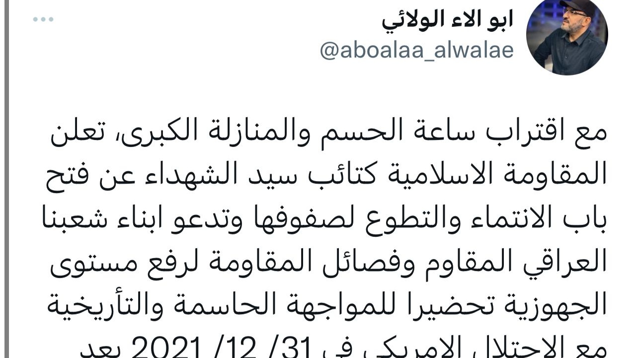 وكتب الأمين العام للكتائب ابو الاء الولائي في تغريدة على تويتر تابعتها "ايلاف" انه "مع اقتراب ساعة الحسم والمنازلة الكبرى تعلن المقاومة الاسلامية كتائب سيد الشهداء عن فتح باب الانتماء والتطوع لصفوفها وتدعو ابناء شعبنا العراقي المقاوم وفصائل المقاومة لرفع مستوى الجهوزية تحضيرا للمواجهة الحاسمة والتأريخية مع الاحتلال الاميركي في 31/ 12/ 2021 بعد الساعة 12 ليلاً".