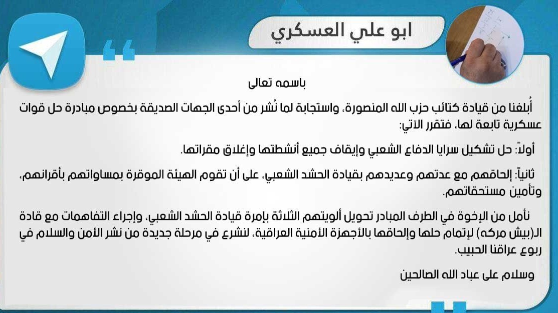 ومن جهتها اعلن كتائب حزب الله العراقي عن حل تشكيل سرايا الدفاع الشعبي التابعة لها. وقال المسؤول الامني للكتائب ابو علي العسكري في تغريدة على تويتر تابعتها "ايلاف" لقد "أبلغنا من قيادة كتائب حزب الله واستجابة لما نشر من أحدى الجهات الصديقة بخصوص مبادرة حل قوات عسكرية تابعة لها فقد تقرر الأتي: حل تشكيل سرايا الدفاع الشعبي وإيقاف جميع أنشطتها وإغلاق مقراتها والحاقها مع عدتها وعديدها بقيادة الحشد الشعبي على أن تقوم الهيئة بمساواتهم بأقرانهم، وتأمين مستحقاتهم".