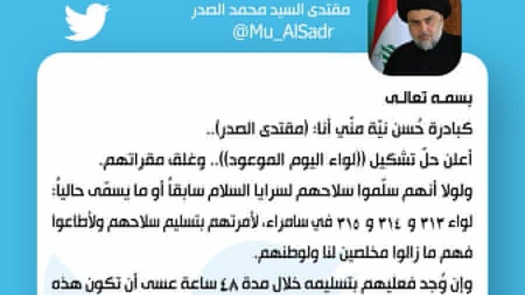 تغريدة الصدر عن حل تشكيله المسلح لواء اليوم الموعود (تويتر)