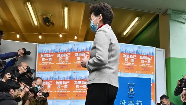 (زعيمة هونج كونج كاري لام تغادر إحدى مراكز الاقتراع بعد الإدلاء بصوتها يوم الأحد)
