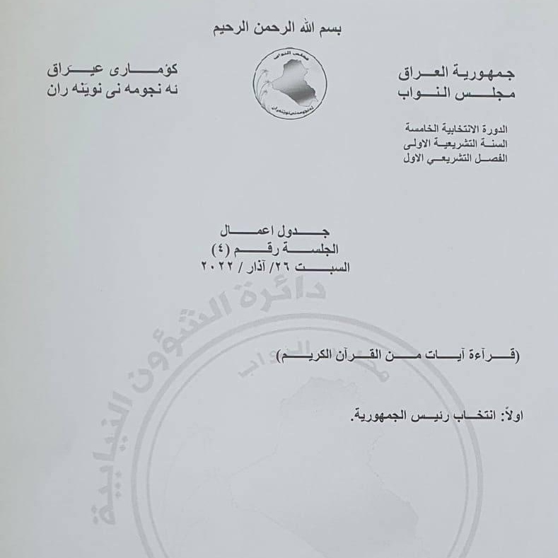 يأتي ذلك فيما اعلنت رئاسة البرلمان العراقي اليوم عن جدول اعمال جلسته غدا السبت منوهة الى انها ستعقد في الساعة 11 صباحا بالتوقيت المحلي (8 بتوقيت غرينتش) وستقتصر على انتخاب رئيس الجمهورية.