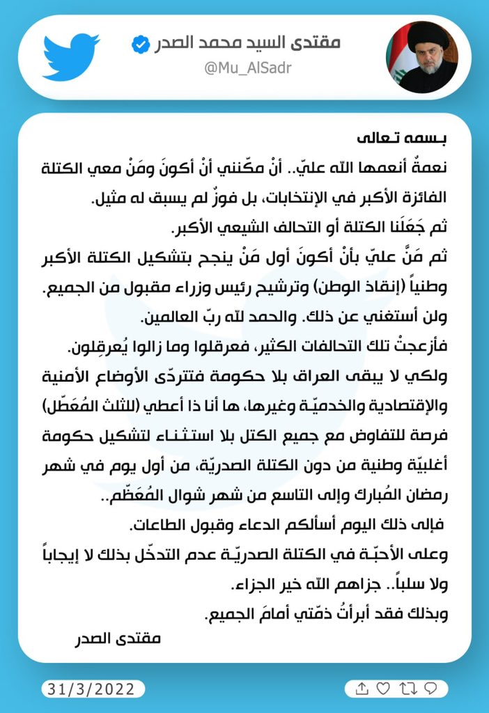 وقال الصدر في نص تغريدته: