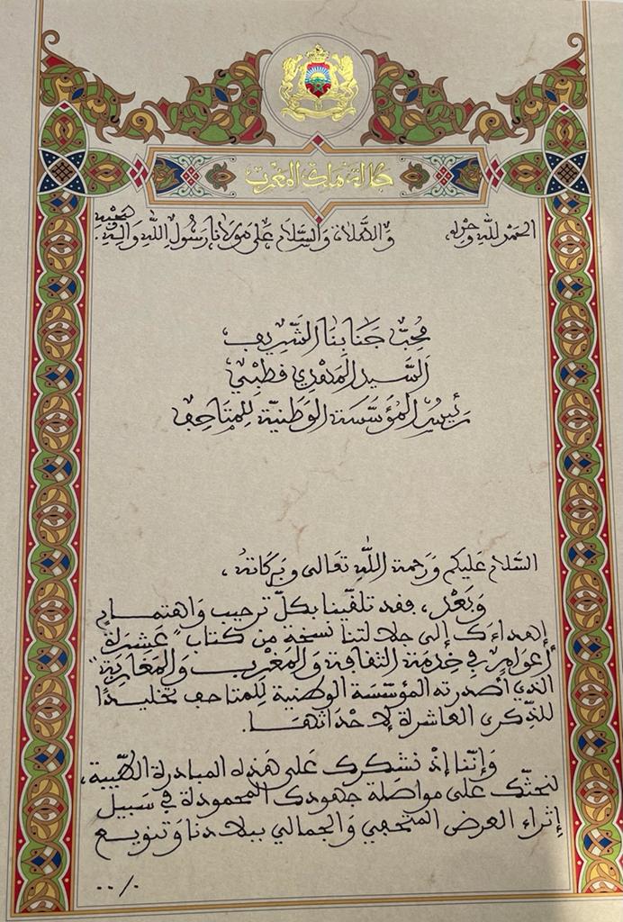 مما جاء في رسالة العاهل المغربي: "محب جنابنا الشريف السيد المهدي قطبي رئيس المؤسسة الوطنية للمتاحف. السلام عليكم ورحمة الله تعالى وبركاته، وبعد، فقد تلقينا بكل ترحيب واهتمام إهداءك إلى جلالتنا نسخة من كتاب "عشرة أعوام في خدمة الثقافة والمغرب والمغاربة" الذي أصدرته المؤسسة الوطنية للمتاحف تخليدا للذكرى العاشرة لإحداثها".
