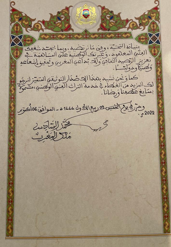 وأضاف العاهل المغربي: "وإننا إذ نشكرك على هذه المبادرة الطيبة، لنحثك على مواصلة جهودك المحمودة في سبيل إثراء العرض المتحفي والجمالي ببلادنا وتنويع بنايته التحتية، وفق ما نرتضيه، وبما يجسد شغفك الفني المعهود، وغيرتك الوطنية على المساهمة في تعزيز الرصيد الثقافي والإبداعي المغربي وتحقيق إشعاعه وطنيا ودوليا. كما ونحن نشيد بهذا الإصدار التوثيقي المتميز لنرجو لك المزيد من العطاء في خدمة التراث الفني الوطني مشمولا بسابغ عطفنا ورضانا".