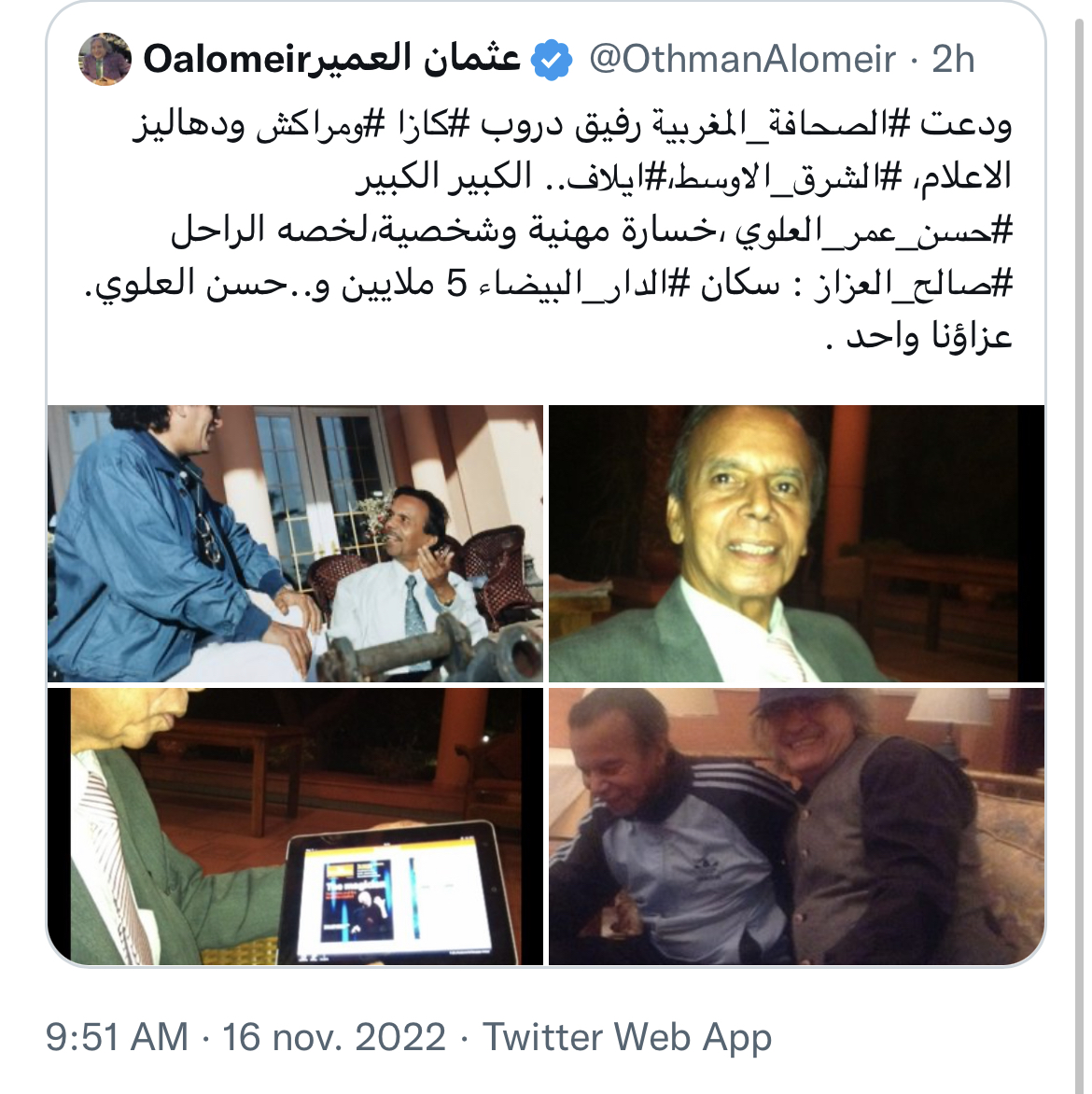 وكتب صديق عمره ، عثمان العمير ، ناشر إيلاف ، تغريدة في تويتر جاء فيها:" ودعت الصحافةالمغربية رفيق دروب كازا ومراكش ودهاليز الاعلام "الشرق_الاوسط،" وايلاف.. الكبير الكبيرحسن عمر العلوي .خسارة مهنية وشخصية،لخصها الراحل صالح العزاز : سكان الدار البيضاء 5 ملايين و..حسن العلوي.عزاؤنا واحد ".