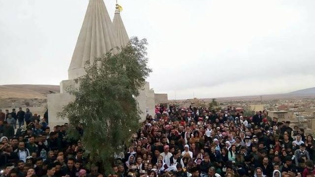 ايزيديون يتجمعون العام الماضي حول أحد مزاراتهم في قضاء سنجار الشمالي بعد ان اعادوا تأهيله اثر تدمير داعش له (تويتر)