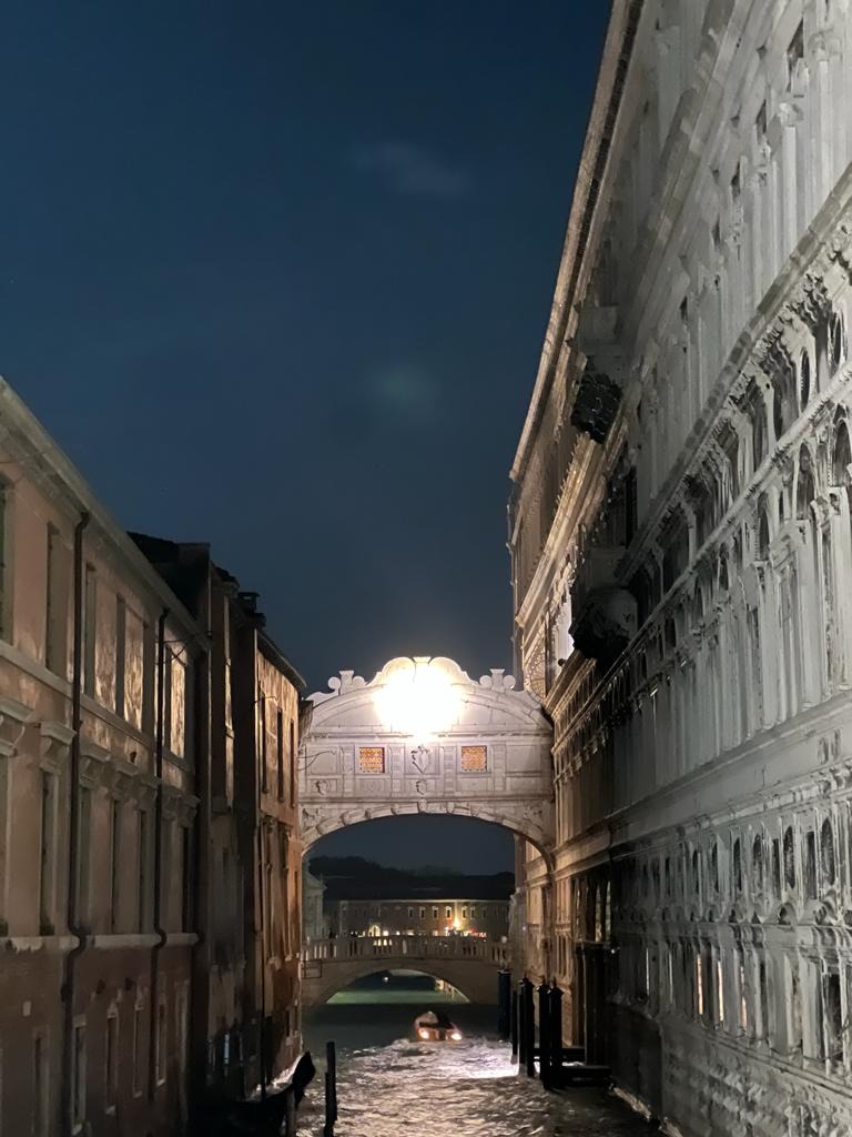 إلى اليمين: قصر دوجيس الشهير (Doges Palace)، وفي الوسط: جسر التنهدات (The Bridge of Sighs)
