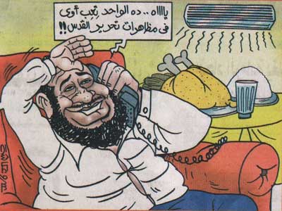 لا، لا، جحود وانكار للنضال الشاق في مظاهرة رابعة العدوية خاصة ان اليوم كان حارا جدا، لدرجة أن زميله بالجريدة والرسام النابه عمرو عكاشة أخبره في اليوم التالي ndash; الاثنين ndash; بأنه شاهد وسمع صديقا له من الإخوان من قادة المظاهرة جالساً في حجرة مكيفة وأمامه ديك رومي وماء ويشكو في الهاتف لصديق له قائلا: ياااااه، ده الواحد تعب أوي في مظاهرات تحرير القدس.