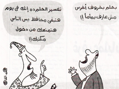وهو ما يقودنا الى مؤتمرهم يوم الجمعة تحت عنوان-لا للعنف- بينما صيحات القتال والارهاب غطته وامتدت المسخرة الى امور كثيرة وكان رسالة اشد وضوحا من تعيين محافظ الاقصر لامريكا والاتحاد الاوروبي والمعارضة، لكن زميلنا الرسام النابه استوقفني لبرهة على اساس ان لديه معلومة اهم من معلومات صفوت عبد الغني لفهمي هويدي وأنها موجودة في نفس اليوم- السبت- بـrsquo;المصري اليومrsquo;، وهي أنه كان عند احد العرافين لاستشارته في امر ما فشاهد عضوا من الجماعة الاسلامية يسأل العراف: بحلم بخروف اخرس مش عارف يمأمأ .. فرد عليه قائلا: تفسير الحلم ده في يوم هتبقى محافظ.. بس الناس هتمنعك من دخول مكتبك.