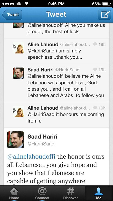 يذكر أن ألين أدت باللغة العربية أغنية quot;خدني معكquot; لوالدتها الفنانة الراحلة سلوى قطريب، ونجحت في إنتزاع إعجاب المدربين الأربعة، وحققت مشاركتها أصداءً كبيرة، فإنهالت عليها رسائل التشجيع سواء من اللبنانيين العاديين أو من زملائها الفنانين، ولكن اللافت كان سلسلة تغريدات متبادلة بينها وبين سعد الحريري الذي وجه تغريدة عبر حسابه الخاص على موقع التواصل الاجتماعي quot;تويترquot; لألين كتب فيها : quot;ألين نفتخر بك، ونتمنى لكِ كل الحظquot;. فردت ألين قائلة: quot;ببساطة أنا عاجزة عن التعبير .. شكراًquot;. فردّ الحريري: quot;لبنان كان عاجزاً عن التعبيرquot;، ودعا جميع اللبنانيين أن يحذوا حذوها.
