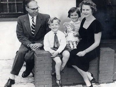 | ثاتشر مع زوجها دنيس وابنيهما التوأمين مارك وكارول في 1959 |