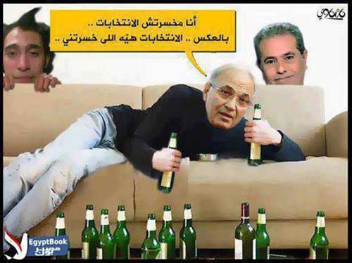 ولأن الفريق أحمد شفيق خسر المعركة، ولكنه حصل على أصوات مرتفعة من محافظة المنوفية مسقط رأس الرئيس السابق حسني مبارك، تقدر بـ80%، خرجت نكتة تقول quot;الجزائر بلد المليون شهيد.. والمنوفية بلد المليون شفيقquot;، quot;لو حماتك مضايقك ومزهقاك في عيشتك.. لبسها تشيرت شفيق وأبعتها التحريرquot;، quot;بعد خسارة شفيق، سافر فرنسا ودخل مطعم أتعشي ولما دفع بقشيش للمضيفة قالته: ميرسي، فطلع جريquot;، في إشارة إلى أن كلمة quot;شكراًquot; بالفرنسية quot;ميرسيquot;، قريبة في النطق من اسم الرئيس محمد quot;مرسيquot;.