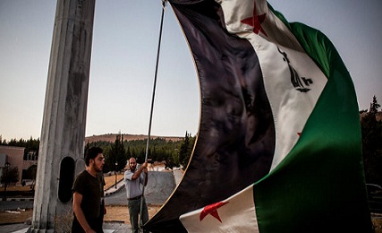 | سوريون يرفعون علم الثورة في باب الهوى قرب تركيا |