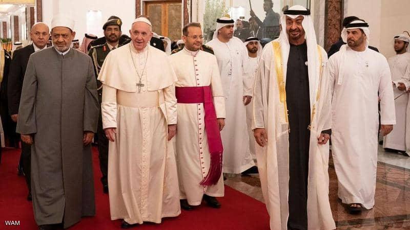 محمد بن زايد مستقبلا شيخ الأزهر والبابا فرنسيس في 2019 - منتدى الأخوة الإنسانية (وام)